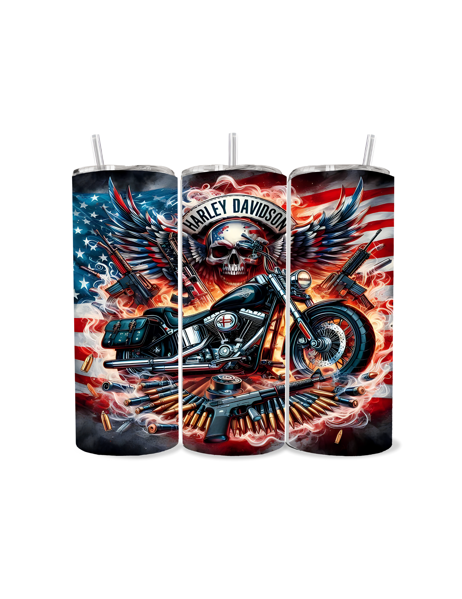 Turn heads with this bold and edgy tumbler, designed for true road warriors and freedom lovers. Featuring a fiery skull, motorcycle, wings, and American flag background, this tumbler captures the spirit of the open road and patriotic pride. Built tough and made to keep your drinks at the perfect temperature, itβs the ultimate companion for your adventures.π₯ Surrounded by flying bullets, smokey flames, and the red, white & blue β itβs not just a cup, itβs a statement.