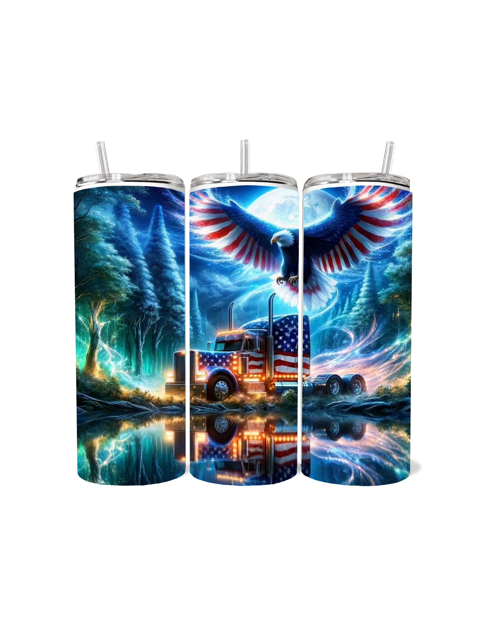 Enjoy beverages in style with the American Pride Trucker 20oz Skinny Tumbler! The tumbler features a bald eagle soaring over an 18-wheeler. The design is set against a backdrop of lights and a patriotic sky. It is perfect for showing love for the country and the trucking spirit.