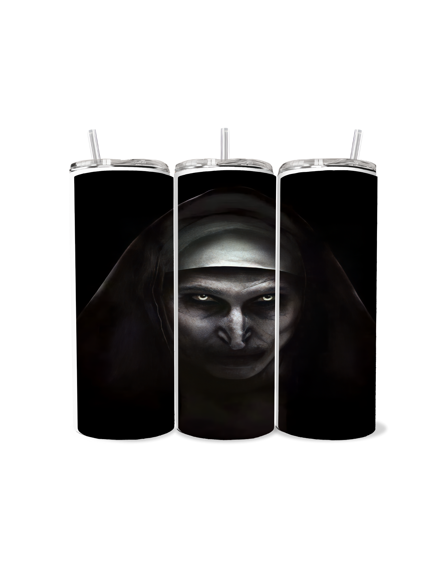 Dare to sip in the dark with ourΒ Nun Horror Tumbler, a spine-chilling 20oz stainless steel drinkware designed for the horror fan with a fearless streak. Featuring a hauntingly realistic image of the infamous demonic nun with glowing eyes and a sinister stare, this tumbler turns heads and raises heart rates.